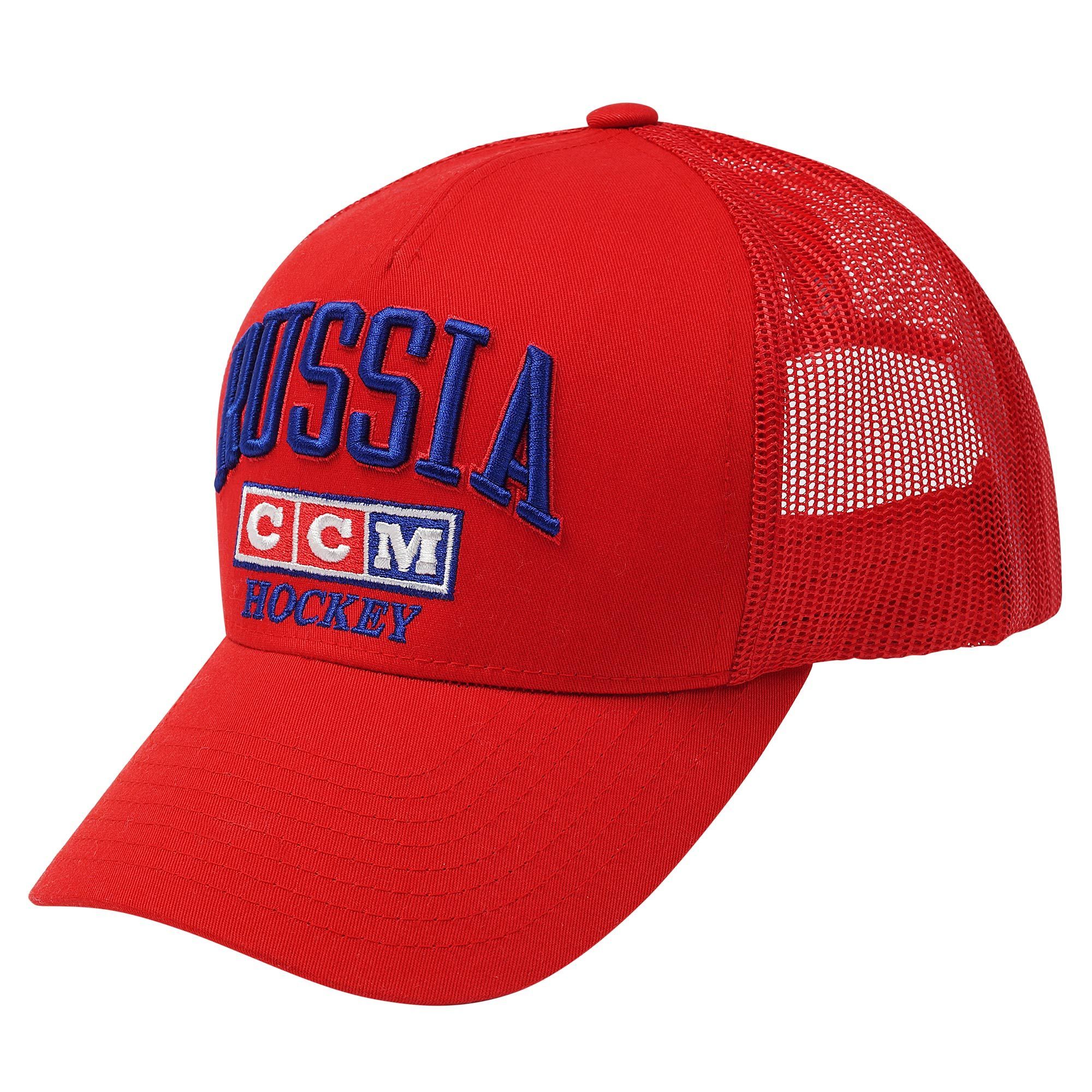 Сзади плотная сетка, которая держит форму. Кепка регулируется по обхвату пластиковой застежкой. На лицевой стороне объемная вышивка Russia и логотип CCM в ретро стиле.